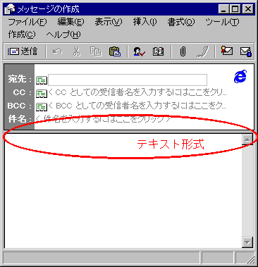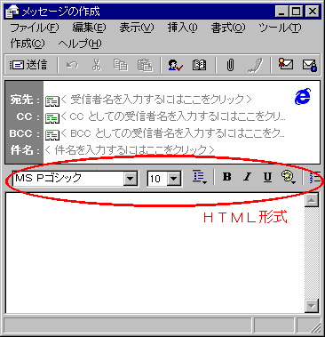 HTML形式で送りたいときは、メッセージ作成時に[書式]メニューから、変更できます。どちらの形式でメッセージを作成しているかは、書式設定のツールバーがあるかないかで判断できます。