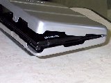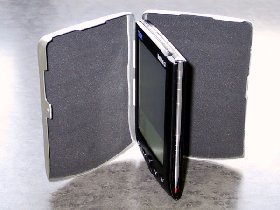 開いたところ。純正のハードケースと同様にスタイラスの溝を利用して装着します。 この棒もアルミです。 差込みに注意しないとPalm側のスタイラス用の溝(スタイラスがカチッと止まる部分?)が破損します。 ちなみに私は破損しました・・・。 内側には黒いスポンジがあり、クッションになってます。 スポンジにはスクロールキーの跡がついてますが、アラームはちゃんと動作します。
