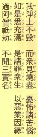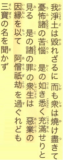 私(釈尊)の浄土は破壊されることはないのに、人々は世界が焼き尽くされ、憂い怖れなどの諸の苦悩が悉く充満していると見るのです。