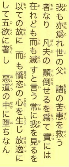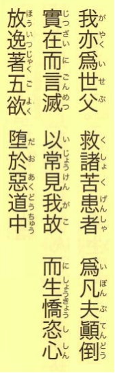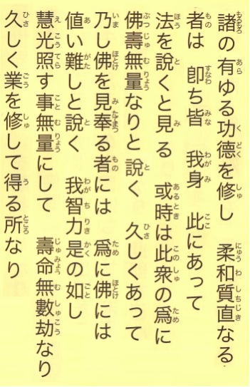 「自我得佛来(真読)」の漢文に返り点(✔)を打って和文にしたものが「我佛を得てよりこのかた(訓読)」です。信徒の皆様には、日常における馴染みの深いお経であると思います。