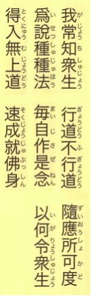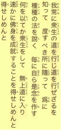 私は、何を以て衆生を無上道(最高の悟り)に入らせて、速やかに仏身を成就させることができるだろうかと、常に念じているのです。 自我偈おわり