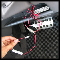 そう表向きは・・・しかし実際には再セットアップなしでの利用が可能です。実は今現在料金ゲートでETC本体の情報と実際にカメラで読み取ったナンバープレートの番号を照合していなからです。理由は厳密に運用すると、バーが開かないことによる事故が起こるからでしょう。(ちなみにETCの再セットアップ料金は役人の天下り先の会社に収まり、彼らが私腹を肥やすシステムです)そこでこれ電源コードの間に脱着可能なコネクターを挿みます。 |