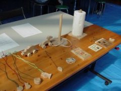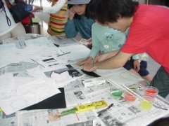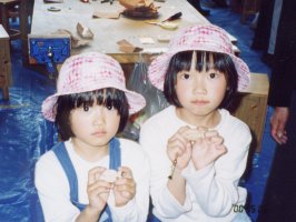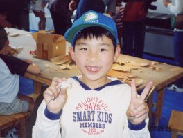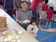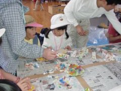 | 写真左が作品見本。子どもたちは作りたいものを選んでいます。待っていただいた人,ごめんなさいね。 | |
