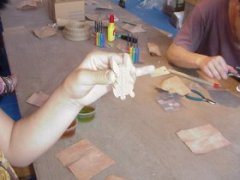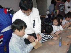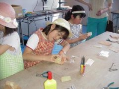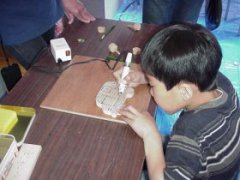 木はいろんなことが気軽にできますね。写真左上から,やすりがけ,焼きペン,ステンシル,糸のこなど。 カーボン紙を使えば,下絵も簡単。 |