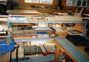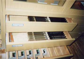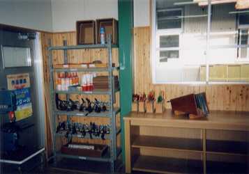 こまごました材料や工具が置いてあります。刃物などで危険なものもこちらにしまってあります。 片付けてから写真を撮ったので,きれいに整理できているでしょう。 |