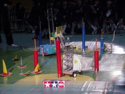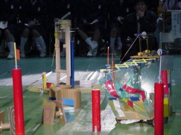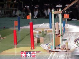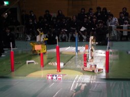 | リングは8畳の広さで,テーマは”capture the flags!!”。円柱にさした旗を取って勝負します。 | ||