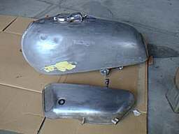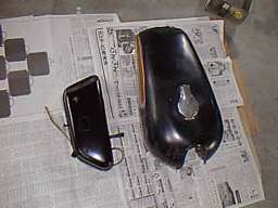 ![]() | 補修前のタンクとオイルタンクです。最初にガソリンで脱脂して、頑固な汚れ等を完全に落とします。 ガソリンをきれいなウエス等に少量しみこませてタンクを吹き上げます。 後のハクリ材のカスを簡単に処理できるように新聞紙を広げ、スペースを確保します。 その時、ハクリ中はタンクをゴロゴロ転がすので下に木の板やダンボールをしくと傷がつかないです。 えっ?RDレストア前報告と内容が違うって?臨機応変です。金属のオイルパンがなかったもので。 |
