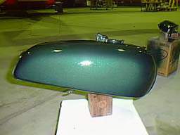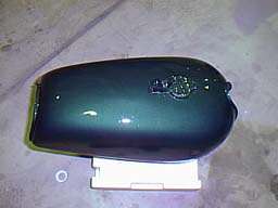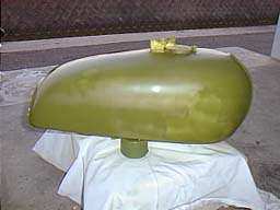 ![]() | どうですか?なんかおいしそうです(笑)べっ甲あめみたい。この画像はクリヤーを吹いた後ですが、まず、ジンクロの塗装面の「ざらざら」をなめらかにするため、1000番くらいのペーパーまたは、荒めのコンパウンドで、表面を軽く研磨します。 ここで、絶対に力をいれないことですね。とにかく、表面を均すことです。このまま、次に塗る塗料がどうみきれいに見えるかがここで、わかれます。 無事、ジンクロの面を滑らかにできたら、次は本塗装に入ります。 タンク全体をガソリンで湿らせたきれいなウエス等でさっとふきます。自分の経験上、すぐに塗るとダメみたいです。3-5分待ちましょう。ガソリンで拭くと気化熱で塗装面の温度が下がり水滴が付くことがあります。 今回はメタリックで、ポリウレタン塗装です。スブレーガンを調節して、塗り始めます。試し塗りでパターンや塗料の量を調節します。調節がおわったら、塗装に入ります。まず塗りにくい所から塗ります。そして、塗り易い部分を塗ります。一度に塗ろうとせず、スプレーパターン(上左から上右、中右から中左、下左から下右といった具合)を守り、スピードも一定で塗ります。 2-3回重ね塗りをして又、塗装面の荒れを前述のようにとります。 |
