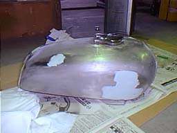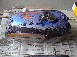 ![]() | おっと!パテです。 どうですか?きれいになりました。このパテの後はなんだろう?タンクの中見たら何か打ち込まれているみたいなのですが・・・ 自分のタンクは給油口がタンクにめりこんでかっこ悪かったですが、板金工具を使って引っ張り出したら「ポコッ」「ポコッ」と出てきました。それも、簡単にです。 この後、パテの処理をするのですが、又ガソリンを使って脱脂します。 |