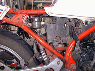 スイングアームを挟む形で付いているはずなのに片持ち?(下写真)タイプでした。RZR’86を見ると