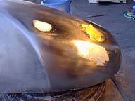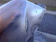 ![]() | ![]() | (左写真参照)シーラントとグラスクロスを施した所(丸印)はあらかじめ、タンクをハンマーでたたき、へこませてから、パテをうめるときれいに仕上がります。 パテは合計10個所で、おおきな物は右写真の右側ですが、平面にかなり近く、楽でした。 難しいのは半径のきつい曲面です。ここはうまくできなかったです。(左写真上側) |