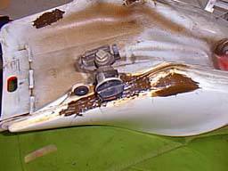 ![]() | もう嫌になります。タンク底部に穴の箇所20個所少々。ハンダを試みたものの、小さい穴から全部はんだでは、到底無理そうです。 そんな訳で、飛行機用の対燃料シーラントPV1420(だっけ?)を使用しました。 大きな穴(直径7mm)くらいのものは、全部このシーラントとグラスクロスを用いて修理しました。 小さい穴は、このシーラントをMEK(メチルエチルケトン)で薄めて、タンクの中に流し込み、小さい穴をふさぎました。 この写真は塗装をハクリせずに実施したものですが、今回はちゃんと全部ハクリして、きちんと脱脂してからシーラントを施しました。このシーラントは塗装がのるため、後々、そんなに目立たなくていいかもしれないと用いました。もちろん、耐久性の方は飛行機で実績があるので、大丈夫だと思います。 タンク内部をコーティングすると言う、大胆かつ将来的な方法で今後は恐らく安心できると思います。 あらかじめ、タンクの内部はバッテリーの電解液、希硫酸を流し込み、半日おいて腐食を取り除きました。 |