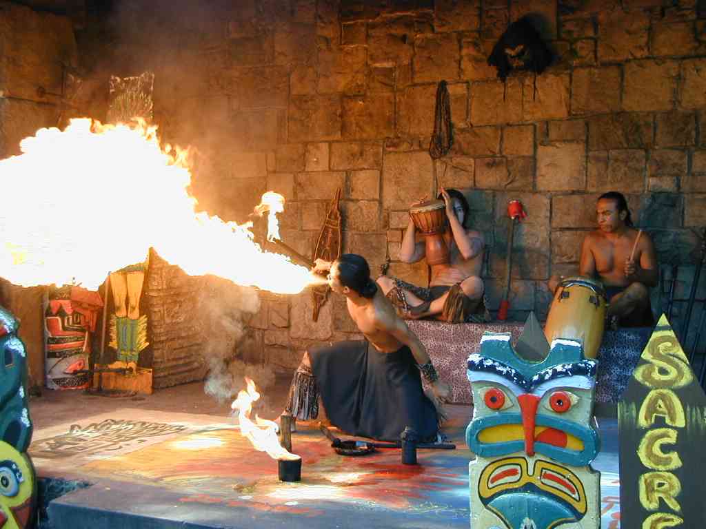 | 13:00 | ケーブルカー(というよりゴンドラ)でセントーサ島へ.アンダーウォーターワールド, ボルケーノランド,ジャイアントマーライオンに入った.Tちゃんよ,お勧めのボルケーノランドはつまんなかったぞ. 前座のダルシム兄さんのファイヤーイーティングは楽しめたけど. | |
