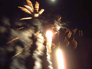 | 夜12時を過ぎると、たいまつ滑走開始。普通はボーゲンで滑るものだと思っていたが、なぜかすごい早さで山頂から下ってくる。よくよく見ると、ボーダーやらタイツだけ履いて上半身裸の人やらいろいろ。さすがにたいまつ滑走をしているところは暗すぎて写真が撮れなかった。 たいまつ滑走が終わると、花火が打ち上げられた。このように頭の真上に打ち上げられる花火を見るのは初めて。馬鹿高い値段の宿泊費には花火代も含まれているのであろう。 |