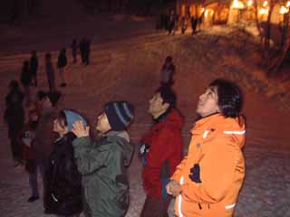 ![]() 大晦日の夜はお約束のたいまつ滑走(を見る)。 ![]() 大晦日の夜零時を過ぎると花火が打ち上げられた。 ![]() 花火を楽しむ生活スキー団団員達。 |