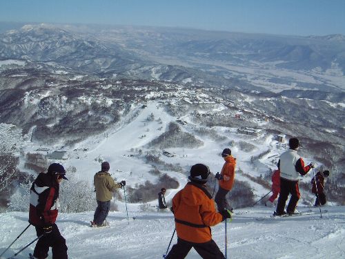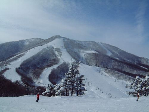 | その後は完全自由行動。旦那M月、TOKU、F井の3人はスノーボードを借りて遊ぶという。僕、K村、ITAの3人はジャイアントをかっ飛び滑りで回すが、せっかくなのでクリスタルコースとは反対側の山頂に登る。ここでITAはリタイア。今日は朝からピーカン。山頂からの眺めも素晴らしい!しばらく景色に見とれた後、滑り降りる。クリスタルコースに比べると斜度も緩く、こぶも少ないため、非圧雪といえども滑りやすい。一気に下まで滑り降りた。でも思ったより距離が短いなぁ。 |
