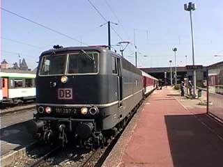 今回の旅行で初めて、乗車口が人間の胸位の高さの列車に出会いました。僕の身長(180cm)でその高さですから、安易に想像がつくと思います。乗車するのには、ステップがあるので問題は無いのですが、問題は3週間の旅行用品が入っているスーツケース2人分・・・・重い・・・何が入っているんだ〜(>0<)と叫びたくなるくらい、重い・・・。妻に助けを求めるわけにも行かず、えらい目をしてひとまずデッキに持ち込みました。この後、荷物の運び方(持ち上げ方)を研究したのは、言うまでもありません。 フランスから出発した列車ですが、車両はドイツ鉄道の車両でした。 発車して程なく、「オリエント急行」とすれ違いになりました!!! カメラを構え!窓側に座っていた妻を乗り越え!窓枠にべたーーーーーーーーーーーーーと張り付き、クールな妻とは対照的に大興奮状態でした。( 後から妻に聞くとこの時呪文のように「オリエント急行じゃ〜」と何度も言っていたそうです) 今回の目的の1つの「オリエント急行」とすれ違い、後何日か寝ると僕はあの列車に乗れるんだ〜とワクワクしたのを覚えています。 途中、Metz-Ville駅でフランスの機関車をドイツの機関車にかえる為に、14分ほど停車しました。この時に車掌もドイツ鉄道の人と変わり、ドイツ鉄道に乗るともらえる、わら半紙みたいな簡易な用紙の列車時刻表(広告付)をもらいました。(1等車だけのサービスなのか?などは不明です。)座席に無造作に置いてあることもあります。 |