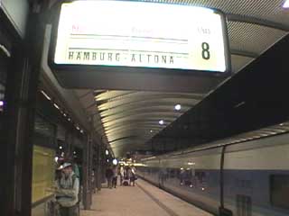 フランクフルト駅に帰ってくるともうすることが無く、駅をうろうろしていました。妻は暇つぶしのゲームをしていました。駅のフードショップで夕飯を食べていたところ、隣に座ったドイツ人らしき人たちが日本のビールを片手に食事をしていた・・・・ドイツと言えばソーセージとビールと思ったのですが、なんか日本のビールもドイツビールに負けていないようで嬉しかった。 荷物預かり所の終了時間となり、荷物を引き取り、列車の発車する時間0時15分まで、ラウンジでボーッと待つことにしました。ユーレイルパスを持っていると、「DBラウンジ」が利用できます。ただし、飲み物代は有料だったと思います。(頼まなくても問題なし)場所が2階で、ガラス張りだったので列車と人の往来を見ているうちに時間は瞬く間に過ぎました。妻の機嫌悪さのピークも迎え、今日の写真撮影禁止令が発動されました・・・・。でも、撮った写真があったりするが・・・撮れたのが嬉しくて自慢して・・ばれた。 0時15分発の寝台列車(DB NachtZug)でハンブルグに向かいました。向い側のホームには、モスクワ行きの列車が止まっており、シベリア鉄道に夢をはせていました。今回の旅行がもう少し長くできたなら・・・現実に乗れたのですが。(ただし、この翌年にシベリア鉄道に乗りに行っています。詳しくは、こちらからどうぞ! 乗車したDB NachtZugはタルゴ型の車両で、スペインにしか無いと思っていた車両に乗れ、感激もひとしおで大満足ものでしたが・・・妻には車両の型より、中の綺麗さが受けました。 鉄道:Frankfurt am Main Hbf駅0:15発→(DB NachtZug1598)→Hamburg Hbf駅6:43着 |
