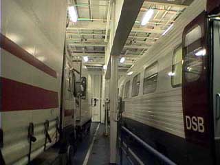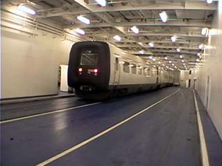 途中プットガルテンで列車はフェリーの内部に入り込みます。妻は何事が起こったのかわからず戸惑っていたみたいです。 フェリー航送区間では列車から降りてフェリーの中で過ごすことができます。乗船時間は1時間足らずですが、船内には免税店や軽食スタンドもあり退屈はしませんでした。甲板に出てみると、4月でも北欧の風はまだ冷たくびゅうびゅうと吹いていたのですぐに退散しました。犬のペットを連れて散歩している乗客もおり、犬好きな妻は風にも負けずすごくご機嫌でした。公共交通機関でペットと一緒に旅ができるなんてさすが欧州だなぁって感心しました。(日本ではペットを連れて船や列車には乗ってないですからね。) |