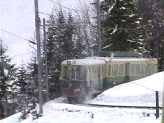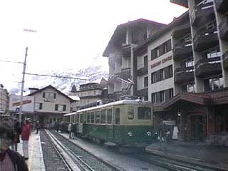 グリンデルワルトでWAB鉄道に乗り換え。ラックレールの歯車がかみ合ってゴトゴトと山を登って行く。山腹に点在する建物がいかにもアルプスらしくてうれしくなる。車内は観光客やスキーヤーで満員だ。 クライネシャイデックに着いた時はあたり一面雪の中だった。ここでまた乗り換え。ユングフラウ鉄道でユングフラウヨッホを目指す。車内はまるで通勤電車並みの混雑。ユングフラウ鉄道の乗り換えたら少し走ったところで急に止まった。「何事か?」と列車の中がざわざわ・・・ふたりで顔を見合わせていたところに所掌さんが・・・周りに母国語で話しているが、まったく分からず英語で聞いてみた・・・「FIRE」の部分と「BACK TO STATION」だけが聞き取れた。「・・・なんだ、火事か」・・・・・・・・・・・・・・・・・・・・・・・・・ 「火事!!!!!」 どんな状況か?はっきり分からなかったが、結構みんなのんきでした。結局煙がどこからか?出ていたようだったが、戻らず目的地に向かった。(新聞の1面に載るような火事じゃなくて良かった。(^_^;)) クライネシャイデックを出てすぐにトンネルに入り、終点までずっとトンネルの中です。初めはものめずらしくてもすぐに眠くなります。 途中、アイガーベント駅で小休止。列車を降りて展望台からの眺めを楽しめます。 |