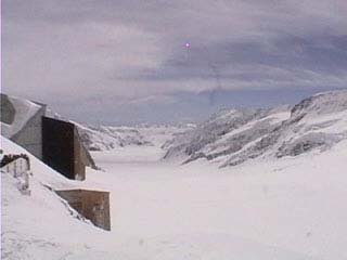 ヨーロッパ最高地点の駅(Top of Europe)、ユングフラウヨッホ駅到着。到着前のアナウンスはテープながら日本語の案内もあってびっくりしました。 外に出るまでの通路には、氷河を削って作った氷の宮殿があります。そこを通ってユングフラウヨッホに降り立ちました。 山の上だと言うのを痛感します。はしゃぎまわると息が上がる・・・。雪だるまを作って記念写真と行きたいのですが、さらさらの雪でなかなか雪だるまを作れませんでした。(スキーヤーにとってはパウダースノー。最高だろうなぁ。と思いながら「かみさんを転がせばふもとまで無事に届くかな・・・?」と考えていた。) アレッチ氷河の雄大な眺めを見ながら昼食。ヨッホ駅来場記念として構内にある郵便ポストに絵葉書を投函する。 |