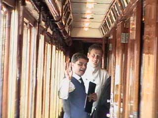 また、列車内に売店と簡単に言えないほど豪華なブティックがありましたので、買い物を数点しました。(VSOEのロゴマーク入りのネクタイなどなど)買い物後、相手の商品間違いに気づき、またブティックへ 部屋に帰ってきてまた違いに気づき、ブティックへ・・・・何度往復させればいいの!!とご立腹な妻。しかし、私が行っても言葉が通じなくて困ることもある。で、基本的には妻がうろうろしていました。 この時の店員は慣れてないらしくて、あくせくされてましたが、商品を部屋に持ってきてくれたりとサービスは良かったです。 そういえば、このときにアテンダントの姿をしたベアーを妻にプレゼントしました。あのベアーは今では部屋に桃太郎のテディーベアーと一緒に飾ってあります。(これがこの旅行内の唯一の妻へのプレゼントだったような・・・・)妻はVSOEのマークが入ったカフスボタンをプレゼントしてくれました♪ |