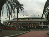 南宮崎駅前の、宮交シティーバスターミナルから、バスで宮崎市営球場へ向かう。旅の第二の目的、東京読売巨人軍宮崎キャンプを見るためだ。国道のワシントンパームの木がなんとも宮崎らしい。